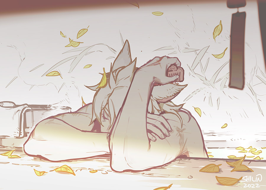 When he was young, he found it difficult to conceal himself from prey as his light appearance stands out amidst the dark, lush boughs of the Twelveswood. Without having seen real hunters at work, it also never crossed his mind to use tools to make prey easier to catch. From the start, every hunt was a contest of speed and stamina, a challenge he happened to gladly accept because he loved the feeling of exertion.