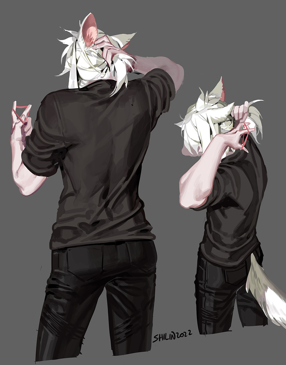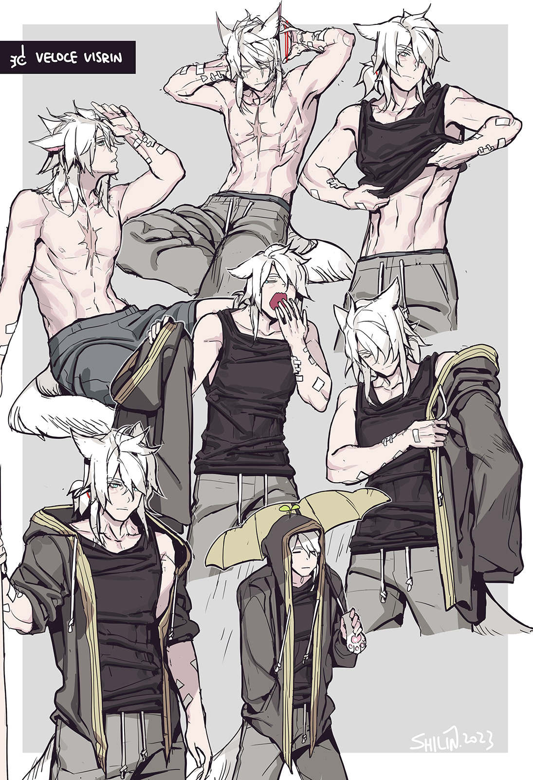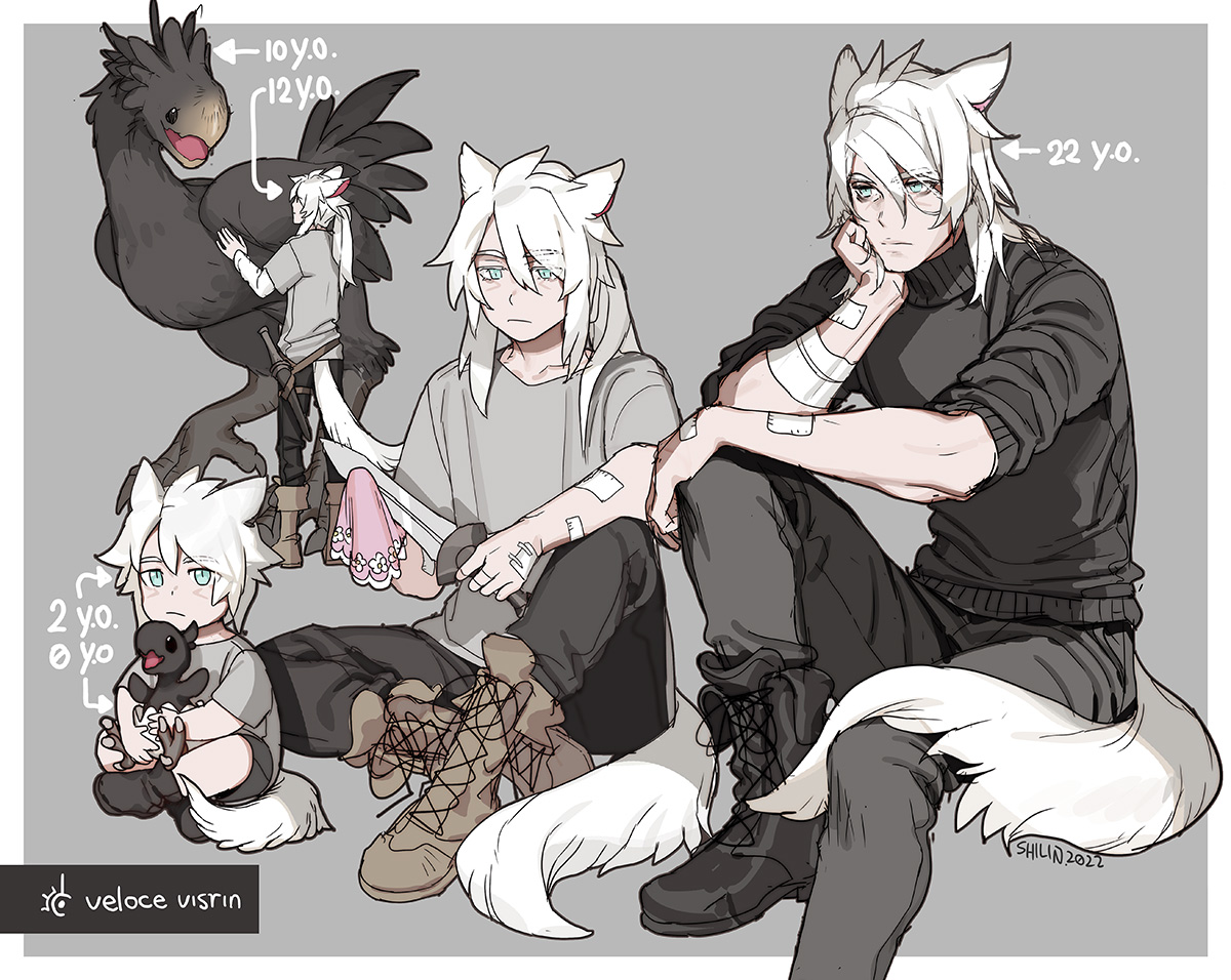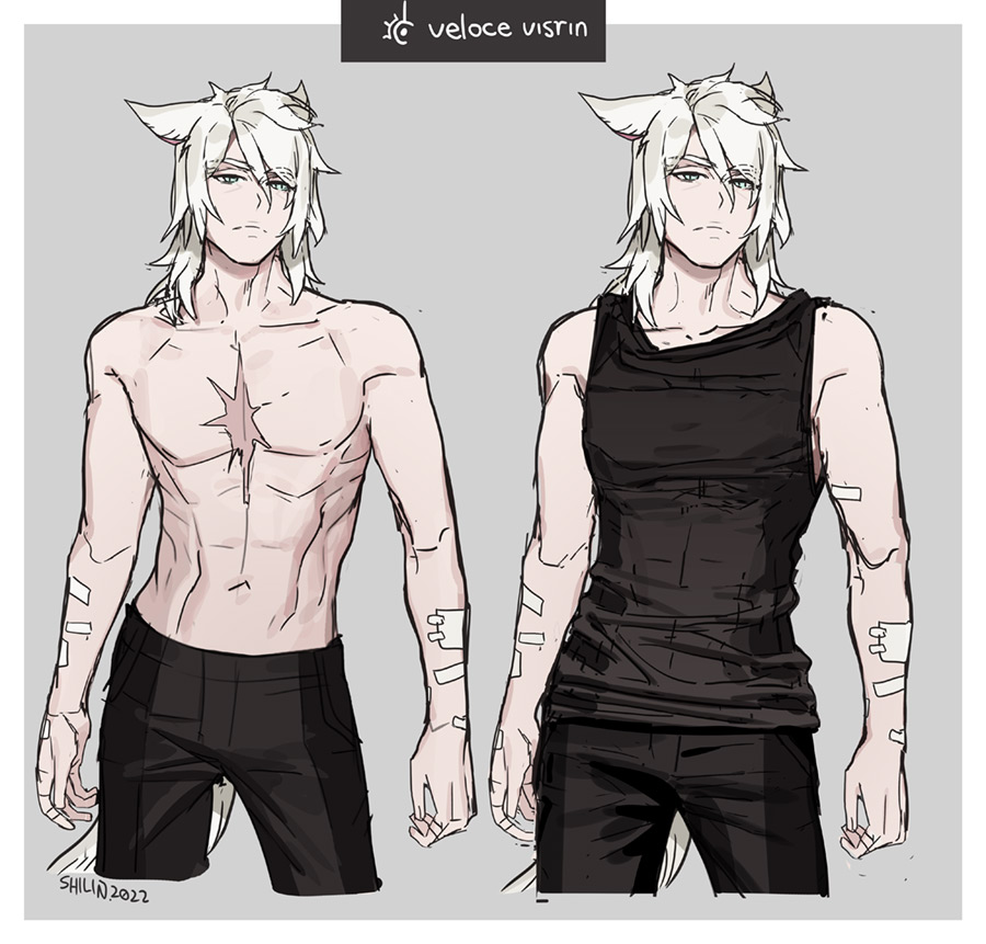 Appearance: Very pale skin, lighter than usual Miqo'te face marks, forearms and hands always covered with small scars and bandages, big scar over his heart