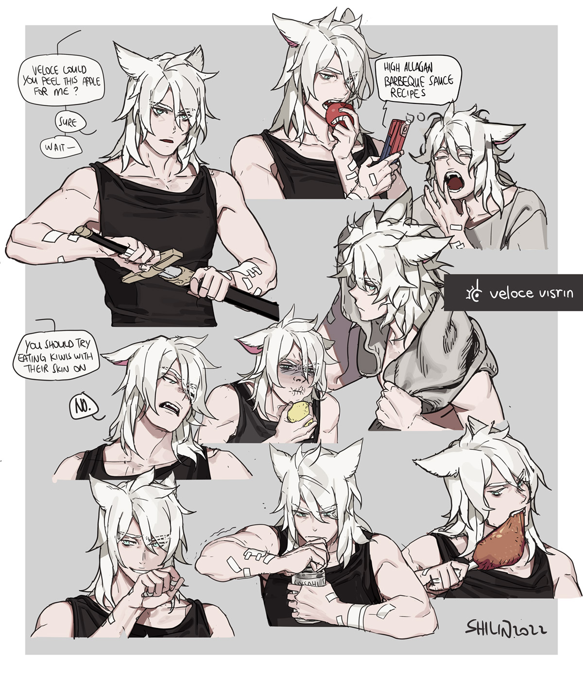 Veloce has a simple palate, preferring familiar foods and their natural flvaours, although he has grown fond of certain light spices he came across in his travels. His favourites are roasted meat and hearty stews, and though he has gathered and eaten a much wider variety of meat, fruits, and vegetables than the average person, he usually finds new exotic food options unpleasant. He handles spiciness poorly and it causes him pain.