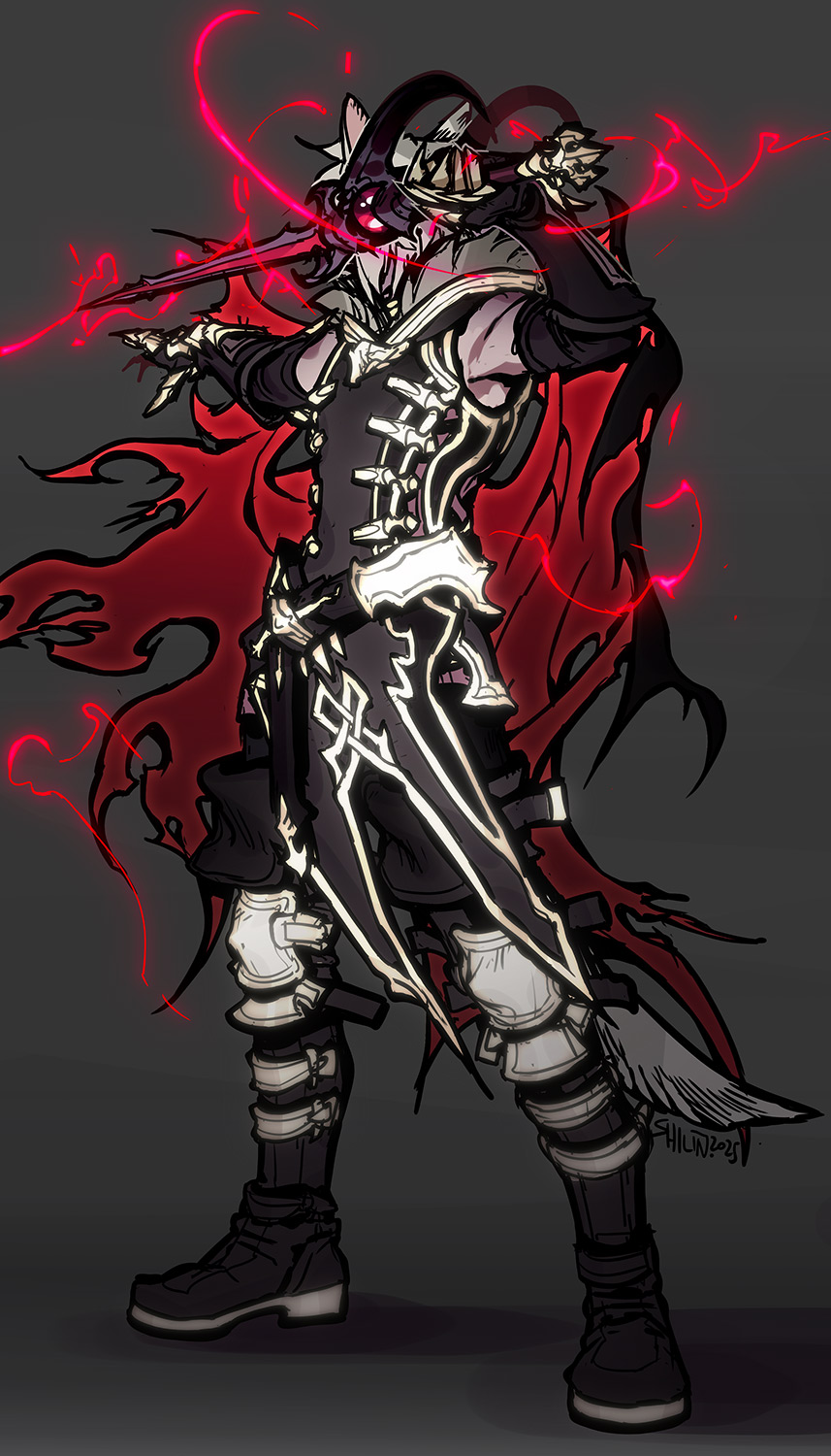 RDM gives him the choice between spells and close-ranged attacks; his background as a GLA and his hunting style gives him a preference for the latter as he tends to stay close to his opponent and use long chains of enchanted sword attacks, the magic causing his slashes to pierce through armour and barriers and leave burning bleeds and wounds. He builds up and amplifies most of this mana through physical movement rather than spell casts.