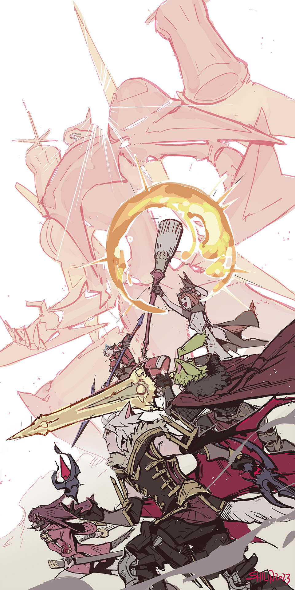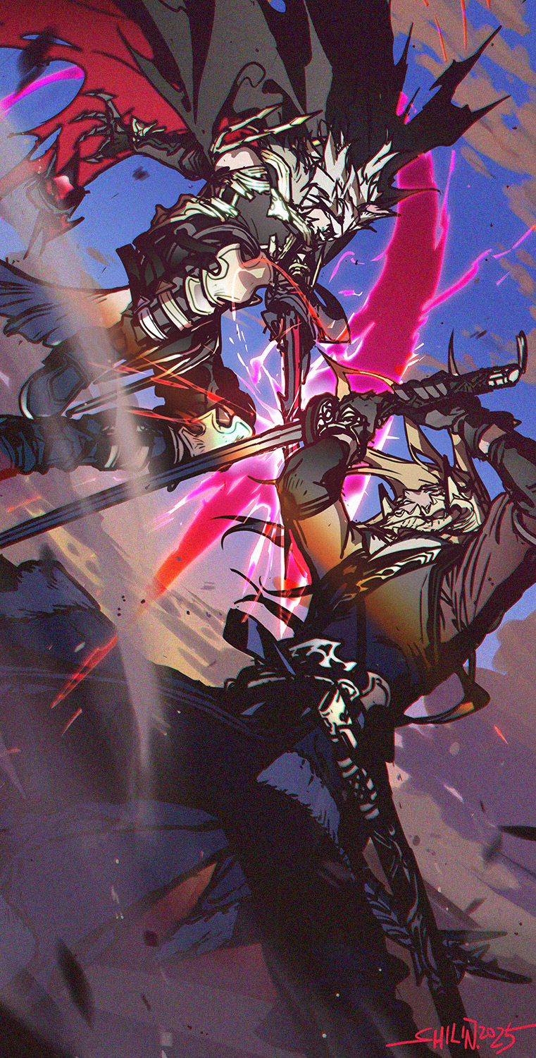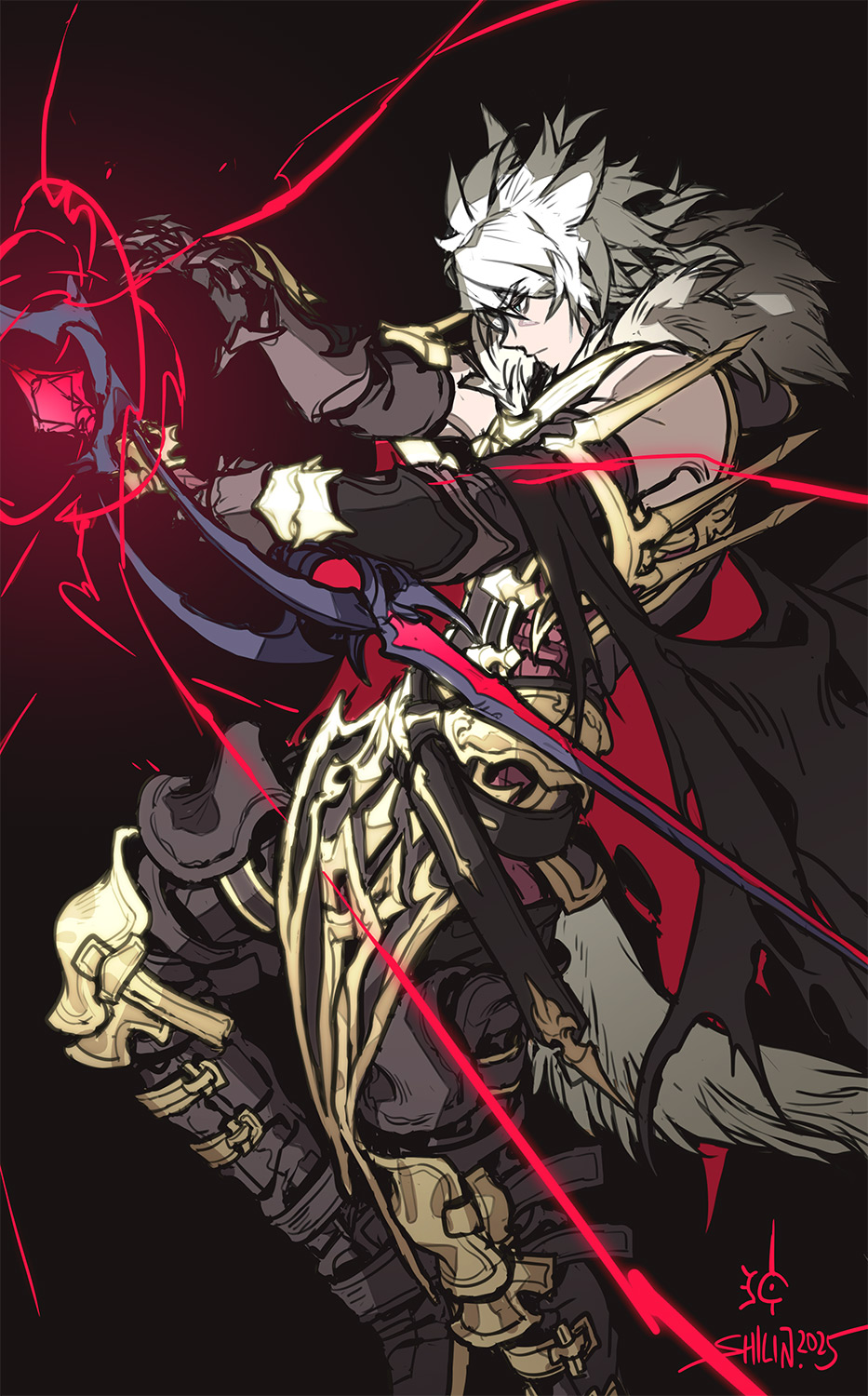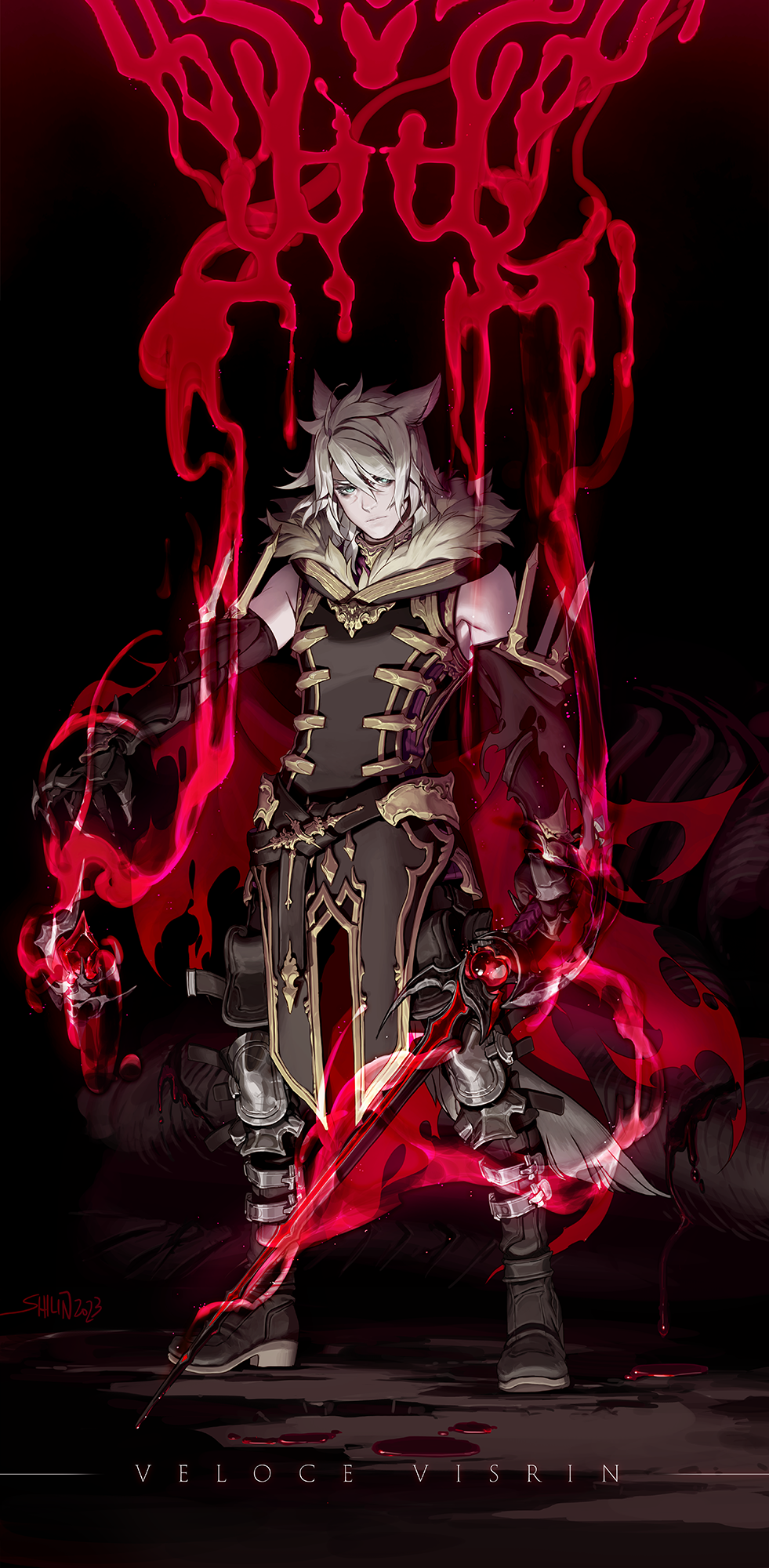 RDM gives him the choice between spells and close-ranged attacks; his background as a GLA and his hunting style gives him a preference for the latter as he tends to stay close to his opponent and use long chains of enchanted sword attacks, the magic causing his slashes to pierce through armour and barriers and leave burning bleeds and wounds. He builds up and amplifies most of this mana through physical movement rather than spell casts.